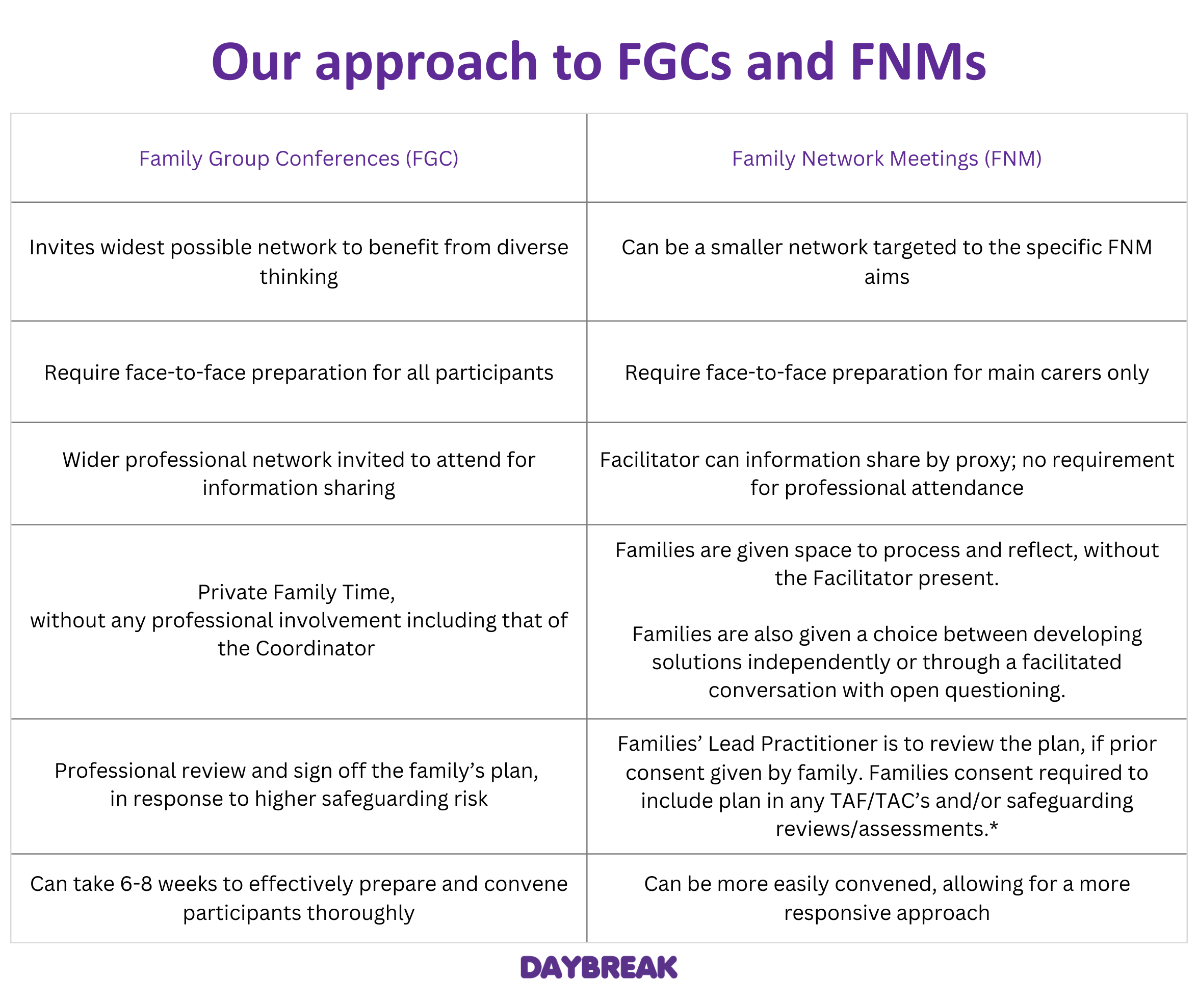 At Daybreak, we believe families should be able to seek help and find solutions before statutory services become deeply involved – and after, if they do. FGDM offers a powerful opportunity to leave a legacy. It aids the development of lasting skills, strengthened support networks, and problem-solving that protects safety. By embedding these values and approaches, families are more able to independently be safe, move forward and thrive.